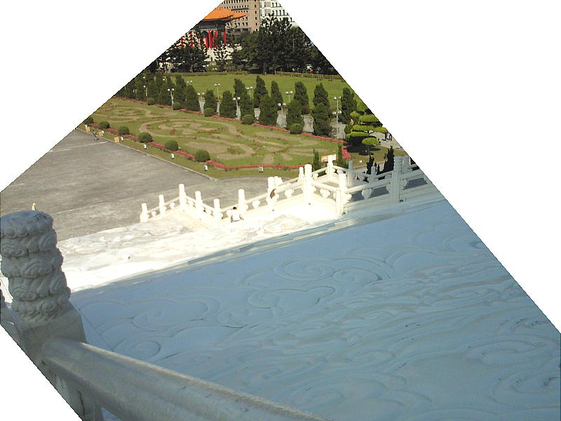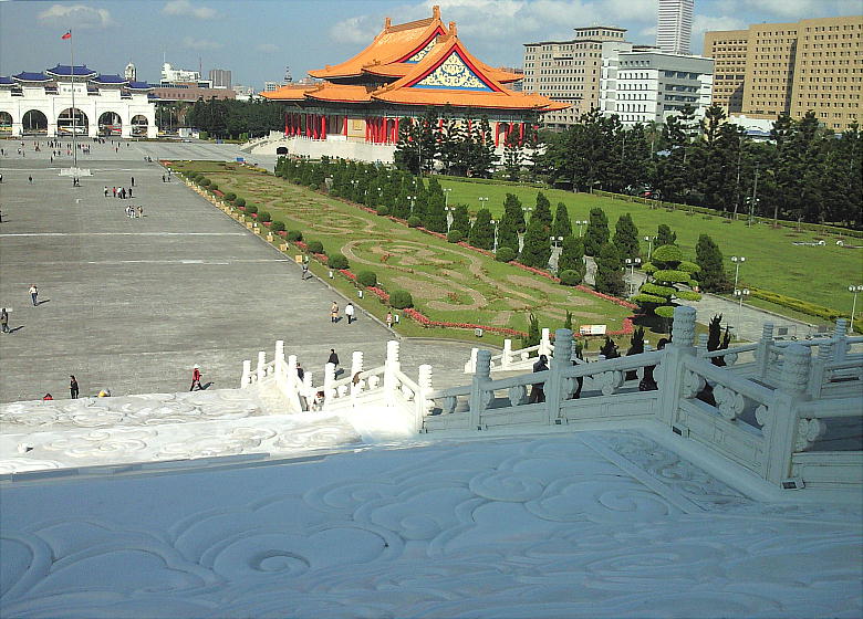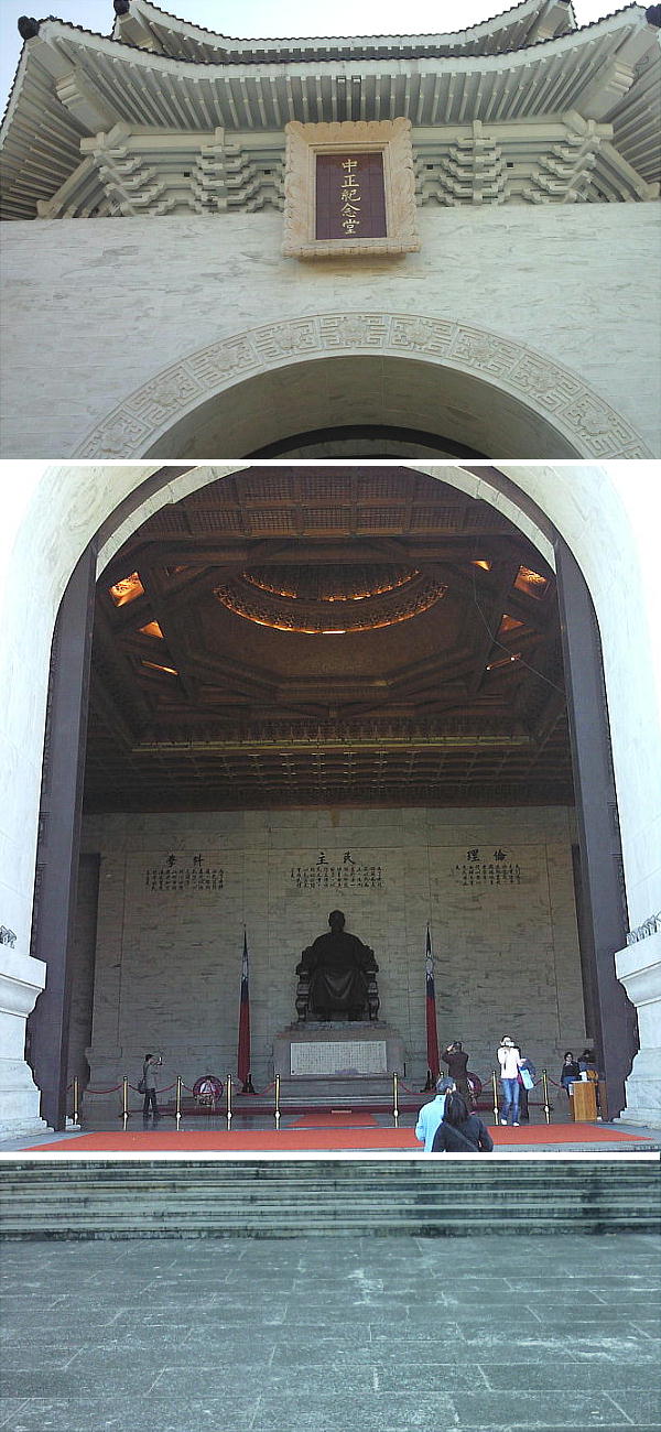 宮殿や廟堂にのみ用いられる参拝路)がある他、3層ある階段によって?介石と中華民国が奉ずる三民主義の「民権、民族、