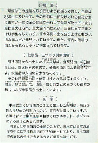 内濠は延長1km、最大幅6m、深さ4mの巨大なものである。途中が丘遺跡と同じように、大量の土器、石器、陶けん