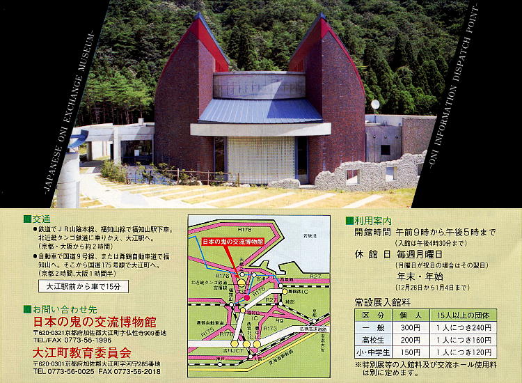 大江町には、「大江山の鬼」をテーマにした「日本の鬼の交流博物館」があり、近くの大江駅前には日本最大の大鬼瓦(お