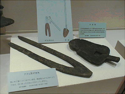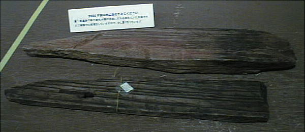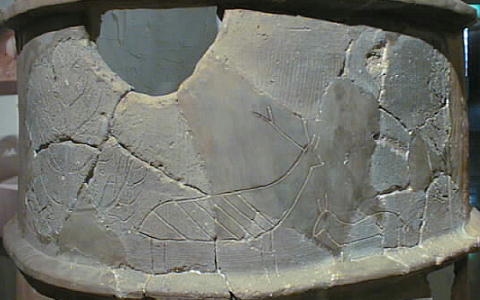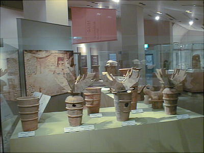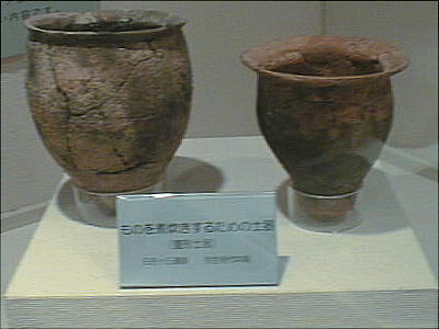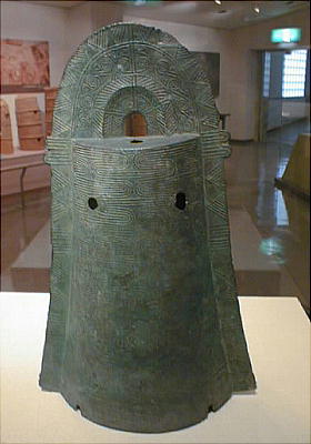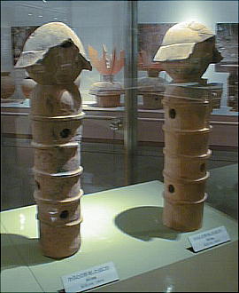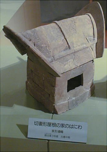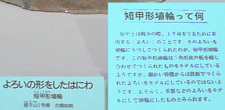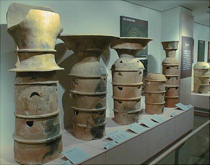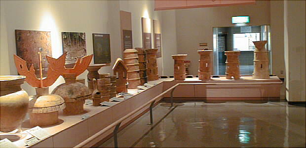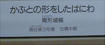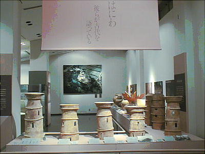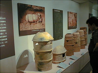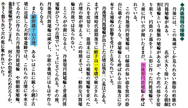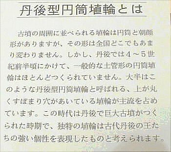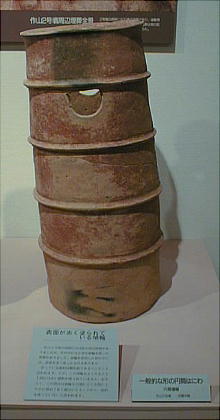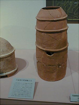 ■丹後特有の丸い頭部をもつ円筒埴輪(加悦町 蛭子山1号墳、古墳時代前期後半 高さ68.0cm、加悦町教育委員会蔵) 丹後型円筒埴輪と呼ばれている。この埴輪を墳丘のまわりに配する蛭子山1号墳は、全長145メートルの日本海側の巨大 前方後円墳のひとつである。丹後地域でも、中期のある段階になると、他の地域に一般的なまっすぐな円筒形となる。この 埴輪が用いられたのはある特定の時期だけのようだ。
