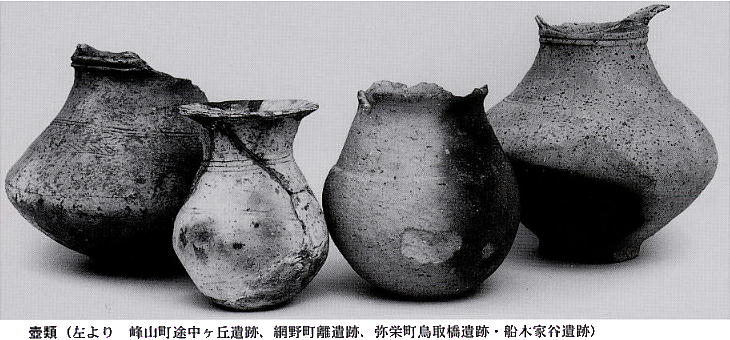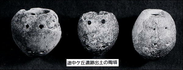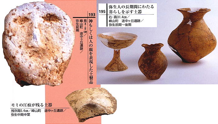 途中ヶ丘、扇谷の両遺跡からは弥生時代の代表的遺物である大量の土器、石器、鉄器、陶けん(土笛)が出土。途中ヶ丘遺