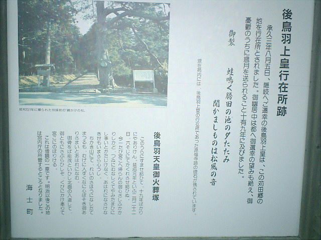 隠岐に、順徳天皇は佐渡に島流しにされて、その地で逝去したが、遺骨はこの地に運ばれて埋葬された。