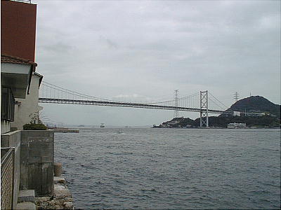 目の前に美しい朱塗りの赤間神宮、右手に大きな関門橋が見える。安徳天皇ら平家一門が沈んだ壇ノ浦の古戦場はその