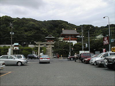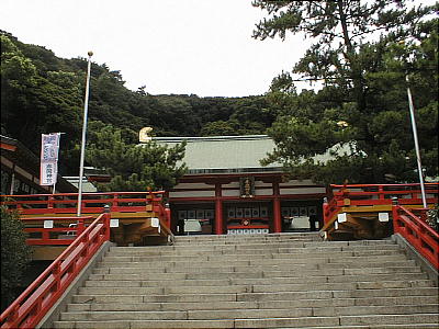 再建したもので、赤い社殿と緑の木々に白い石、それに青い海が美事なハーモニーを奏でていて、絵本の竜宮城のよう