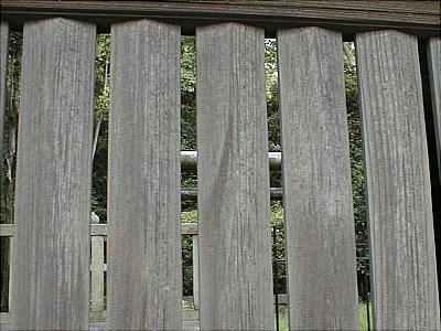 板戸の隙間から陵墓の前に建てられた鳥居が見える。ここは他の多くの陵墓と異なって、裏側から陵墓を見ることができる。