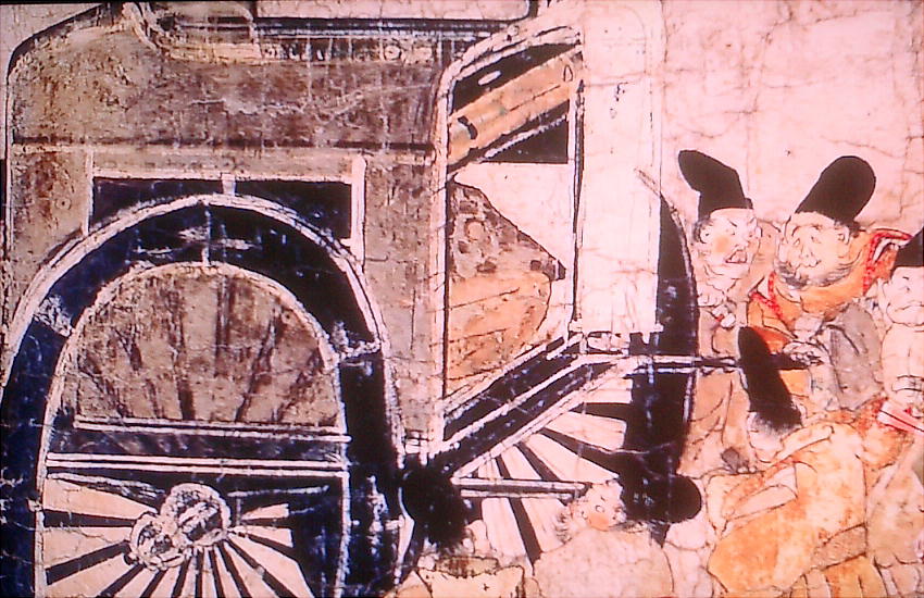 網代車に後ろ向きに座らされた大納言が連行されていく。