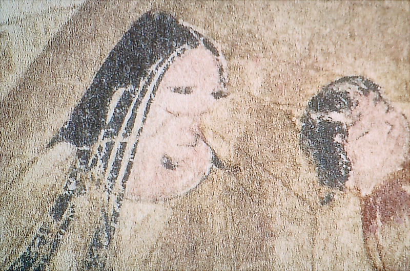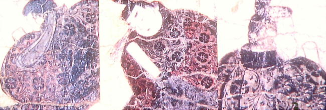 束帯の左右で色が違っているのは、実はこの間にもう一枚絵が存在していたが、紛失したので左側を後から書き足したという説もある。