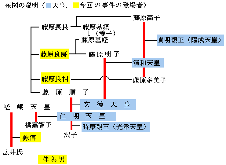 だが、この事件にはかなりの疑問点があり、事件には複雑な政治的背景がある。清和天皇は、当時最大の実力者藤原良房の孫にあた