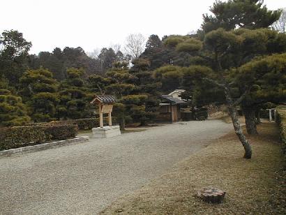 らしきものの残っているところがあるがこれも後世の造作のようである。本来堀はなかったようだ。正面右に五葉の松があ