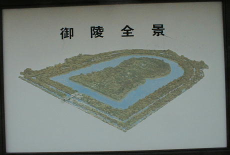 古墳は3段築造の前方後円墳で両側に造りだしを持ち、その墳丘をめぐって3重の周濠が造られ、その外側に12の陪冢が造ら れている。墳丘には葺石(ふきいし)が葺かれ、2万個の埴輪が並んでいたと推測される。 徳川時代中期(嘉永5年:1852)に、時の堺奉行川村修就は御陵の荒廃を憂いて陵内を整備したと伝えられる。明治5年、前方部 の第2段目がやや崩れ、石積の竪穴式石室が発見された。長持型石棺と、石室面の間から金銅性の甲冑・刀剣の断片、ガラスの椀 などが発見されたが元通り埋めたとも、外部へ流出したとも言われている。この時、石棺と甲冑を精密に写した図が残っていて、 それを元にした復元石棺が堺博物館に展示されている。