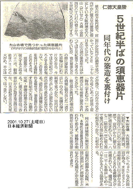 初期古墳が発生して約100年ほどたった5世紀のはじめ頃には、ようやく我が国も統一のきざしが見え始めたと考えられている。 特に近畿地方においては河内を中心にした勢力が大きく、現在の和泉平野の百舌鳥、古市に大古墳群が築かれている。 これは、中国の史書「宋書」に見える「讃・珍・済・興・武」の「倭の五王」の時代で、これらの大王達の墳墓がこの百舌鳥・ 古市古墳群であろうとされる。第16代仁徳天皇は倭王「讃」にあたるとする説もあるが、「珍」とする説もある。次の履中天皇 を「讃」にあてる説もあるし、先の応神天皇を「讃」とする説もある。ことほど左様に、現状では「倭の五王」はほとんど特定 できていないと言ってよい。またある説によれば、応神天皇と仁徳天皇は同一人物とも言う。 17代履中天皇陵、「珍」にあたるとされる18代反正天皇の陵も、すべてこの古墳群の中にある。