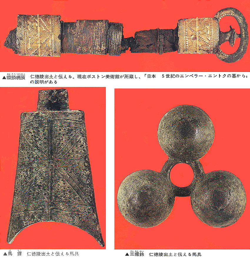 また当時の堺県令某は、「鷺の糞の掃除」と宮内省に願い出て古墳を開け、相当の遺物を外部へ横流ししたとの話もある。現在 堺博物館、ボストン美術館やフィラデルフィア美術館等々に残っている「伝仁徳陵出土」とされる剣や鏡はこの時の流出品だと も言う。
