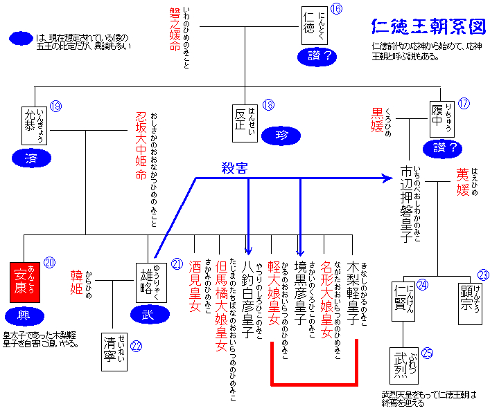 【大雀命】仁徳天皇 (古事記) 大雀命、坐難波之高津宮、治天下也。 此天皇、娶葛城之曾都毘古之女、石之日賣命【大后】、生御子、大江之伊邪本和氣命。次蝮之水齒別命。次男淺津間若子宿禰命 【四柱】 又娶上云日向之諸縣君牛諸之女、髮長比賣、生御子、波多毘能大郎子【自波下四字以音。下效此】亦名大日下王。次波多毘能若 郎女。亦名長日比賣命。亦名若日下部命【二柱】 又娶庶妹八田若郎女。又娶庶妹宇遲能若郎女。此之二柱無御子也。 凡此大雀天皇之御子等并六王【男王五柱女王一柱】故、伊邪本和氣命者、治天下也。次、蝮之水齒別命、亦治天下。 次、男淺津間若子宿禰命、亦治天下也。 此天皇之御世、爲大后石之日賣命之御名代、定葛城部、亦爲太子伊邪本和氣命之御名代、定壬生部、亦爲水齒別命之御名代、定 蝮部、亦爲大日下王之御名代、定大日下部、爲若日下部王之御名代、定若日下部。 又役秦人作茨田堤及茨田三宅、又作丸邇池、依網池、又堀難波之堀江而通海、又堀小椅江、又定墨江之津。 於是天皇、登高山見四方之國、詔之。「於國中烟不發。國皆貧窮。故、自今至三年、悉除人民之課役。」是以大殿破壞、悉雖雨 漏都勿修理、以■[木咸]受其漏雨、遷避于不漏處。後見國中、於國滿烟。故、爲人民富、今科課役。是以百姓之榮。不苦役使。 故、稱其御世謂聖帝世也。 其大后石之日賣命、甚多嫉妬。故、天皇所使之妾者、不得臨宮中、言立者、足母阿賀迦邇嫉妬。【自母下五字以音】爾天皇、聞 看吉備海部直之女、名黒日賣、其容姿端正、喚上而使也。然畏其大后之嫉、逃下本國。天皇坐高臺、望瞻其黒日賣之船出浮海以 歌曰、 淤岐幣邇波 袁夫泥都羅羅玖 久漏邪夜能 摩佐豆古和藝毛 玖邇幣玖陀良須 故、大后聞是之御歌、大忿、遣人於大浦、追下而、自歩追去。於是天皇、戀其黒日賣、欺大后曰、「欲見淡道嶋而」、幸行之時、 坐淡道嶋、遙望歌曰、 淤志弖流夜 那爾波能佐岐用 伊傳多知弖 和賀久邇美禮婆 阿波志摩 淤能碁呂志摩 阿遲摩佐能 志麻母美由 佐氣都志摩美由 乃自其嶋傳而、幸行吉備國。爾黒日賣、令大坐其國之山方地而、獻大御飯。於是爲煮大御羹、採其地之菘菜時、天皇到坐其孃子 之採菘處歌曰、 夜麻賀多邇 麻祁流阿袁那母 岐備比登登 等母邇斯都米婆 多怒斯久母阿流迦 天皇上幸之時、黒日賣獻御歌曰、 夜麻登幣邇 爾斯布岐阿宜弖 玖毛婆那禮 曾岐袁理登母 和禮和須禮米夜 又歌曰、 夜麻登幣邇 由玖波多賀都麻 許母理豆能 志多用波閇都都 由久波多賀都麻 自此後時、大后爲將豐樂而、於採御綱柏、幸行木國之間、天皇婚八田若郎女。於是大后、御綱柏積盈御船、還幸之時、所驅使於 水取司、吉備國兒嶋之仕丁、是退己國、於難波之大渡、遇所後倉人女之船。乃語云、「天皇者、此日婚八田若郎女而、晝夜戲遊、 若大后不聞看此事乎、靜遊幸行。」爾其倉人女、聞此語言、即追近御船、白之状具如仕丁之言。於是大后大恨怒。載其御船之御 綱柏者、悉投棄於海。故、號其地謂御津前也。即不入坐宮而、引避其御船、泝於堀江、隨河而上幸山代。此時歌曰、 都藝泥布夜 夜麻志呂賀波袁 迦波能煩理 和賀能煩禮婆 迦波能倍邇 淤斐陀弖流 佐斯夫袁 佐斯夫能紀 斯賀斯多邇 淤斐陀弖流 波毘呂 由都麻都婆岐 斯賀波那能 弖理伊麻斯 芝賀波能 比呂理伊麻須波 淤富岐美呂迦母 即自山代迴、到坐那良山口歌曰、 都藝泥布夜 夜麻志呂賀波袁 美夜能煩理 和賀能煩禮婆 阿袁邇余志 那良袁須疑 袁陀弖 夜麻登袁須疑 和賀美賀本斯久邇波 迦豆良紀多迦美夜 和藝幣能阿多理 如此歌而還、暫入坐筒木韓人、名奴理能美之家也。天皇聞看其大后自山代上幸而、使舍人名謂鳥山人、送御歌曰、 夜麻斯呂邇 伊斯祁登理夜麻 伊斯祁伊斯祁 阿賀波斯豆麻邇 伊斯岐阿波牟加母 又續遣丸邇臣口子而、歌曰、 美母呂能 曾能多迦紀那流 意富韋古賀波良 意富韋古賀 波良邇阿流 岐毛牟加布 許許呂袁陀邇迦 阿比淤母波受阿良牟 又歌曰、 都藝泥布 夜麻志呂賣能 許久波母知 宇知斯淤富泥 泥士漏能 斯漏多陀牟岐 麻迦受祁婆許曾 斯良受登母伊波米 故、是口子臣、白此御歌之時、大雨。爾不避其雨、參伏前殿戸者、違出後戸、參伏後殿戸者、違出前戸。爾匍匐進赴、跪于庭中 時、水潦至腰。其臣服著紅紐青摺衣。故、水潦拂紅紐、青皆變紅色。爾口子臣之妹、口日賣、仕奉大后。故、是口日賣歌曰、 夜麻志呂能 都都紀能美夜邇 母能麻袁須 阿賀勢能岐美波 那美多具麻志母 爾大后問其所由之時、答白、僕之兄口子臣也。 於是口子臣、亦其妹口比賣、及奴理能美、三人議而令奏天皇云、大后幸行所以者、奴理能美之所養虫、一度爲匐虫、一度爲鼓、 一度爲飛鳥、有變三色之奇虫。看行此虫而入坐耳。更無異心。如此奏時、天皇詔、然者吾思奇異。故、欲見行。自大宮上幸行、 入坐奴理能美之家時、其奴理能美、己所養之三種虫、獻於大后。爾天皇、御立其大后所坐殿戸、歌曰、 都藝泥布 夜麻斯呂賣能 許久波母知 宇知斯意富泥 佐和佐和爾 那賀伊幣勢許曾 宇知和多須 夜賀波延那須 岐伊理麻韋久禮 此天皇與大后所歌之六