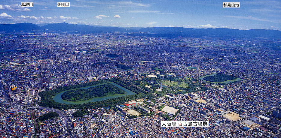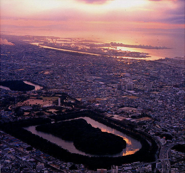 仁徳天皇陵(大山古墳)は日本最大の前方後円墳で、5世紀中頃の築造と考えられている。堺市大仙町にあり、墳丘の全長486m、 後円部の高さ35mで、三重の濠が周りを取り囲んでいるが、外側の濠は明治時代に掘り直されたものである。現在の濠の周りを 歩いて巡れば、約40分程かかる広大な陵であり、大きさで言えば世界一の陵墓である。しかし学会では、この大山古墳を仁徳天 皇陵に比定する説には否定的な意見が多い。陪塚は10基以上あり、日本最大の前方後円墳。北側にある田出井山古墳(反正天 皇陵)と、南側のミサンザイ古墳(履中天皇陵)とともに百舌鳥耳原三陵と呼ばれる。 一帯は古墳公園として整備されており、道路を挟んですぐ向かいに堺博物館が建てられている。 大山古墳(仁徳天皇陵)上空から夕焼けの大阪湾を望む。見れば見るほどデカい。