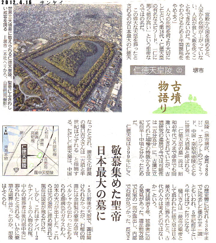 Music: boxer 第16代 仁徳天皇陵 1998.7.11 百舌鳥耳原中陵 <第16代仁徳(にんとく)天皇> 異称: 大鷦鷯天皇(おおさざきのすめらみこと:日本書紀) 生没年: 神功皇后摂政57年 〜 仁徳天皇87年 143歳(古事記では83歳) 在位期間 応神天皇41年+3年(仁徳元年) 〜 仁徳天皇87年 父: 応神天皇 第四子 母: 品蛇真若王(ほむだまわかおう)の娘、仲姫(なかつひめ:五百城入彦(いおきいりひこ)皇子の孫) 皇后: 磐之媛命(いわのひめのみこと)、八田皇女(やたひめ) 皇妃: 日向髪長媛(ひむかのかみながひめ) 皇子皇女: 大兄去来穂別天皇(おおえのいざほわけのすめらみこと:履中天皇)、住吉仲(すみのえのなかつ)皇子、 瑞歯別天皇(みつはわけのすめらみこと:反正天皇)、 雄朝津間稚子宿禰天皇(おあさづまわくごのすくねのみこと:允恭天皇)、大草香皇子 宮: 難波高津宮(なにわたかつのみや:現大阪市中央区) 陵墓: 百舌鳥耳原仲陵(もずのみみはらのなかのみささぎ:大阪府堺市大仙町) 応神天皇の崩御に伴う即位を巡っての逸話は、まさにこの天皇が「仁徳」天皇である様をよく表していると言えよう。応神天皇 41年に天皇が崩御すると、応神天皇が即位を望んだ太子の菟道稚郎子(うじのわきいらつこ)皇子は、兄の大鷦鷯天皇の方が 天皇にふさわしいとして即位を辞退する。大山守皇子がすでに葬り去られた後、皇位継承権はこの二人にあったが、大鷦鷯天皇 は先帝の御心にかなうようにと菟道稚郎子皇子を説得し続ける。しかし菟道稚郎子皇子は耳をかさず3年の歳月が流れる。 日本書紀によると、菟道稚郎子皇子は兄の意志の強いことを見てとると、長生きして天下を混乱させるのは忍びないと自ら命を 絶つ。知らせを聞いた大鷦鷯天皇はすぐさま難波宮を出て菟道宮にかけつけ、弟の亡骸(なきがら)をかき抱いて号泣する。 そして弟の名を三度呼んだとき、菟道稚郎子皇子は息を吹き返して、「兄上こそ聖王であり、この顛末は誤りなく先帝にお伝え します。」と言い残すと永の眠りについた。そこで泣く泣く大鷦鷯天皇は即位して仁徳天皇になった、とされる。 しかし古事記では、単に菟道稚郎子皇子が夭折したので大鷦鷯天皇がやむなく即位したと記されているのみである。 記紀では仁徳天皇は、その諱名にも表われているように、「仁」と「徳」の聖王として描かれている。高殿から人々の生活を視 察し、その困窮ぶりに胸を痛めて三年間税を免除したという話は有名である。仁徳に続く「履中」「反正」「允恭」の御代も、 そういう穏やかな善政の御代として記録されている。 天皇は宮中でも質素倹約を旨とし、衣食住に至っても粗末なもので通すように徹底した。民衆に負担をかけてはならんと、宮殿 の垣根も屋根も直さず、屋根は雨漏りがして夜は星が見えたと言う。 まるで、上杉藩を立て直した上杉鷹山のような話であるが、天皇の努力が功を奏して、やがて五穀豊穣、民は富み、再び各家か ら煙が立ち上るようになった。もう十分でしょうと臣下が課税の再会と宮殿の修理を進めたが天皇は受け入れず、免税措置をや めたのはさらに3年後だったという。 宮殿の修復には、人々は老いも若きも進んで参加し、労を惜しまず参加したと日本書紀は記録する。 仁徳天皇の故事にも見え、また考古学上もこの時代だろうとされる大阪平野の開発も盛んに行われた。中でも「茨田の堤」(ま んだのつつみ)の堤防修復工事は有名である。長い期間人々が苦しんでいた堤防の決壊も、この天皇の御代に修復されたことに より皆無となった。 古墳の濠は、採魚を行う鳥たちには格好の場所である。何処に行ってもアオサギ、シラサギの類やカワセミがいる。 聖帝として名高い仁徳天皇だが、女性関係もなかなか発展家である。美人で評判の吉備の黒媛(くろひめ)を宮中へ呼び寄せた が、黒媛は嫉妬深い皇后、磐之媛命(いわのひめのみこと)のいじめに耐えきれなくなり、とうとう吉備へ逃げ帰ってしまい、 黒媛が恋しい天皇は、皇后には淡路島に狩りに出かけると嘘をついて吉備の国へ出かけていったりしている。 現在、岡山県の「吉備風土記の丘」には、この黒媛の墓といわれるこうもり塚古墳が残っている。 また、八田皇女を見初めて皇妃にしようとするが、皇后の強烈な反対に遭う。天皇は何とか説得しようと歌を作って皇后へ送っ たりするが、皇后は頑として受け入れない。そこで天皇は皇后が紀の国へ出かけた隙を狙って八田皇女を宮中に入れてしまう。 皇后は怒り狂い、大和へ戻って山城の筒城宮(つづきのみや)に籠もり、とうとうそこで薨去してしまう。 八田皇女を妃とした後は、今度は八田皇女の妹雌鳥(めとり)皇女(古事記では女鳥王)に心惹かれるが、使者として雌鳥皇女 を迎えに行った異母弟の隼別(はやぶさわけ)皇子(古事記では速総別王)に雌鳥皇女を取られてしまう。雌鳥皇女が「鷦鷯」 よりも「隼」のほうがすばらしいという意味の歌を詠んだため、天皇は激高し追っ手を差し向けて二人を殺してしまう。 古墳は3段築造の前方後円墳