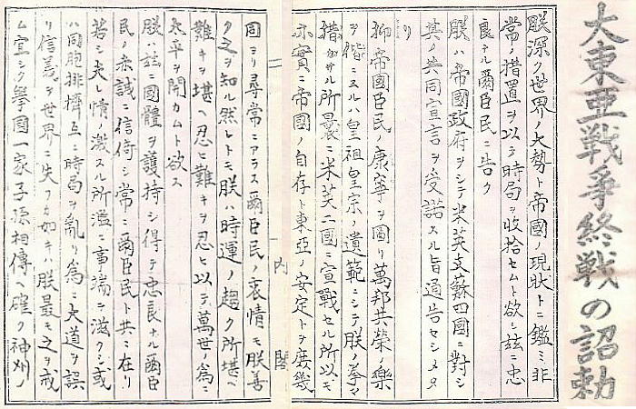 朕深ク世界ノ大勢ト帝國ノ現状トニ鑑ミ非常ノ措置ヲ以テ時局ヲ収拾セムト欲シ茲ニ忠良ナル爾臣民ニ告ク