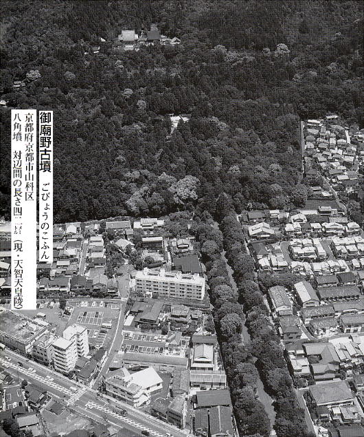 以下の天智陵は、考古学的には「御廟野古墳」と呼ばれている。山科盆地北辺の南向きのゆるやかな傾斜面に位置し、古墳時代終末期。