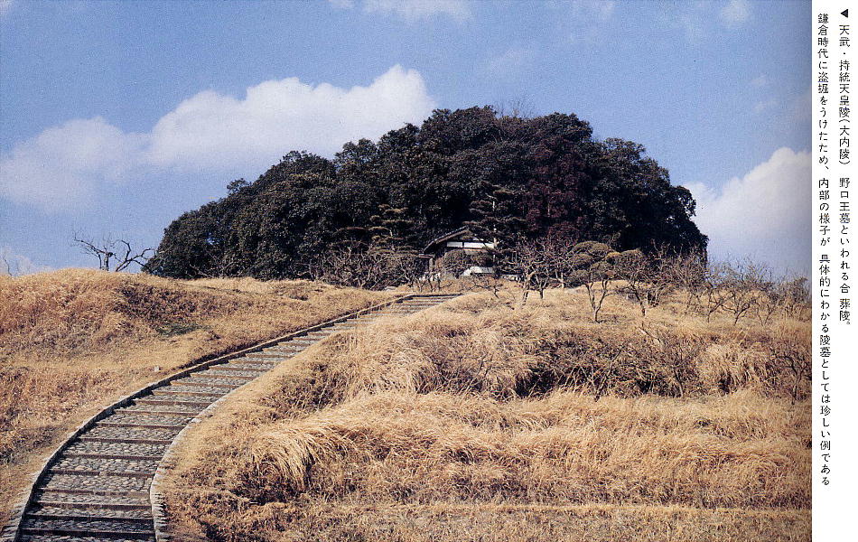 天武天皇と皇后持統天皇の夫婦合葬陵。持統天皇元年(687)に築造され、翌年に天武天皇を埋葬した。8角形の5段築造で、東西45m、