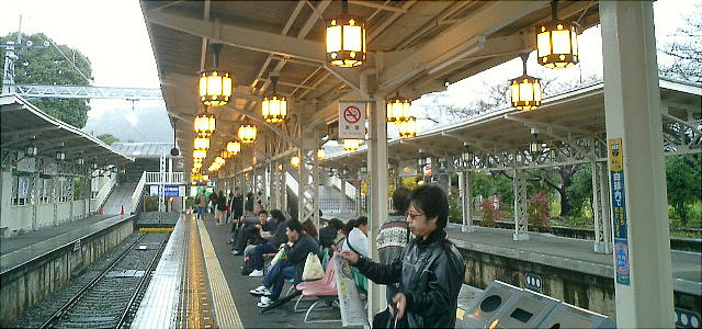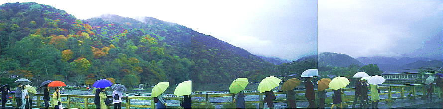 雨の嵐山渡月橋(上)と阪急電車嵐山駅のホーム(下)。
