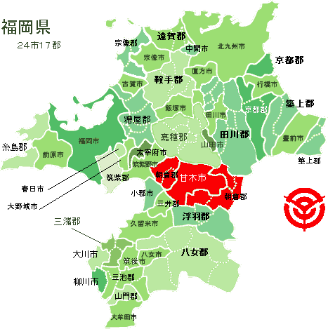 (平成の大合併で、夜須町と三輪町は合併して「筑前町」となります。おそらく平成17年中に。その他は従来通り。)